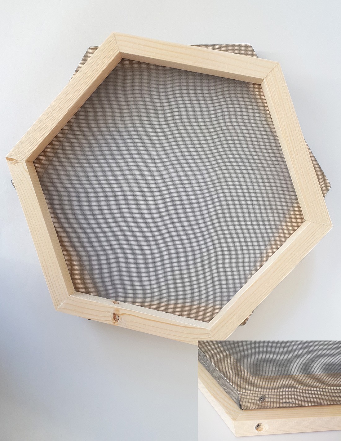 1 Tamis pâte à papier + cadre gabarit : Héxagone régulier : côté intérieur 12cm (Hauteur de côté à côté ou largeur de la feuille ~ 21 cm).